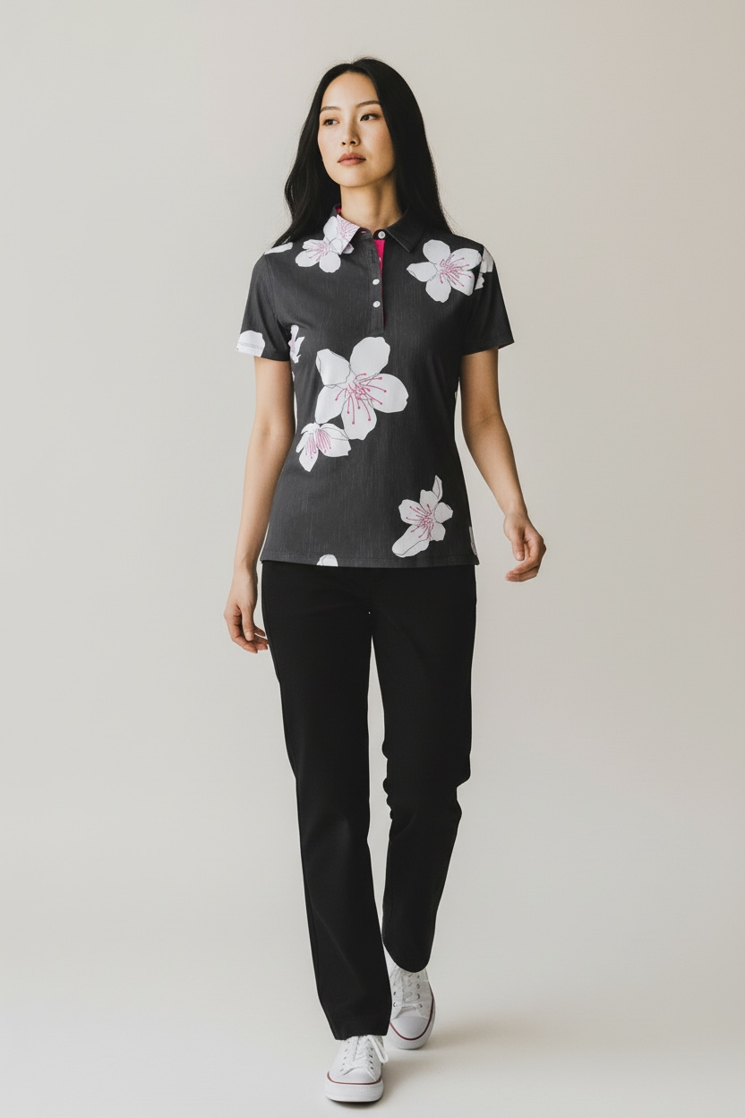 Inspired by the fleeting beauty of sakura (Japanese cherry blossoms), the "Cherreh" polo captures contrast at its finest with delicate florals set against a rich, night-black textured backdrop. Soft sakura pink accents bloom across the design, creating a look that's bold yet refined.