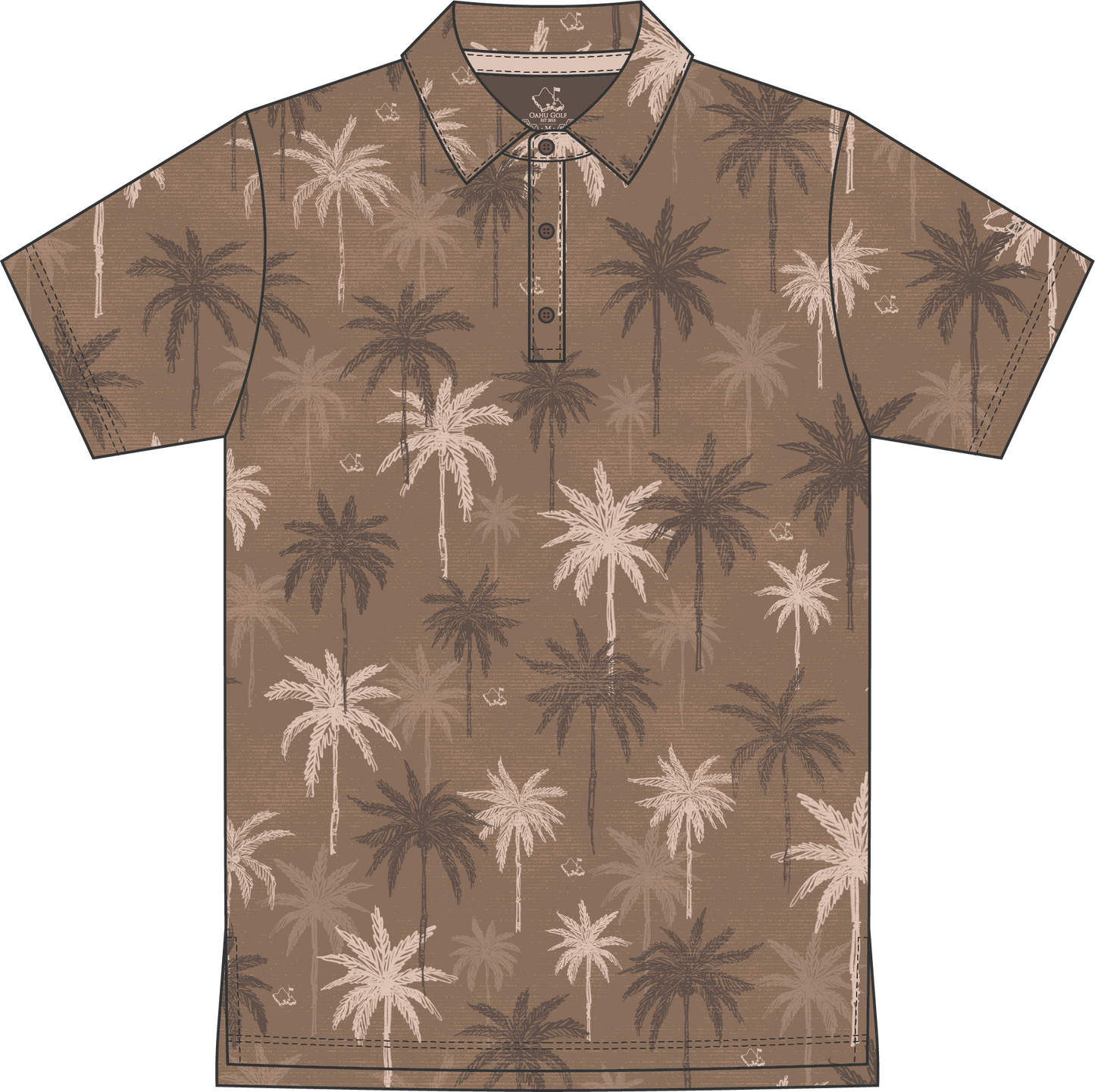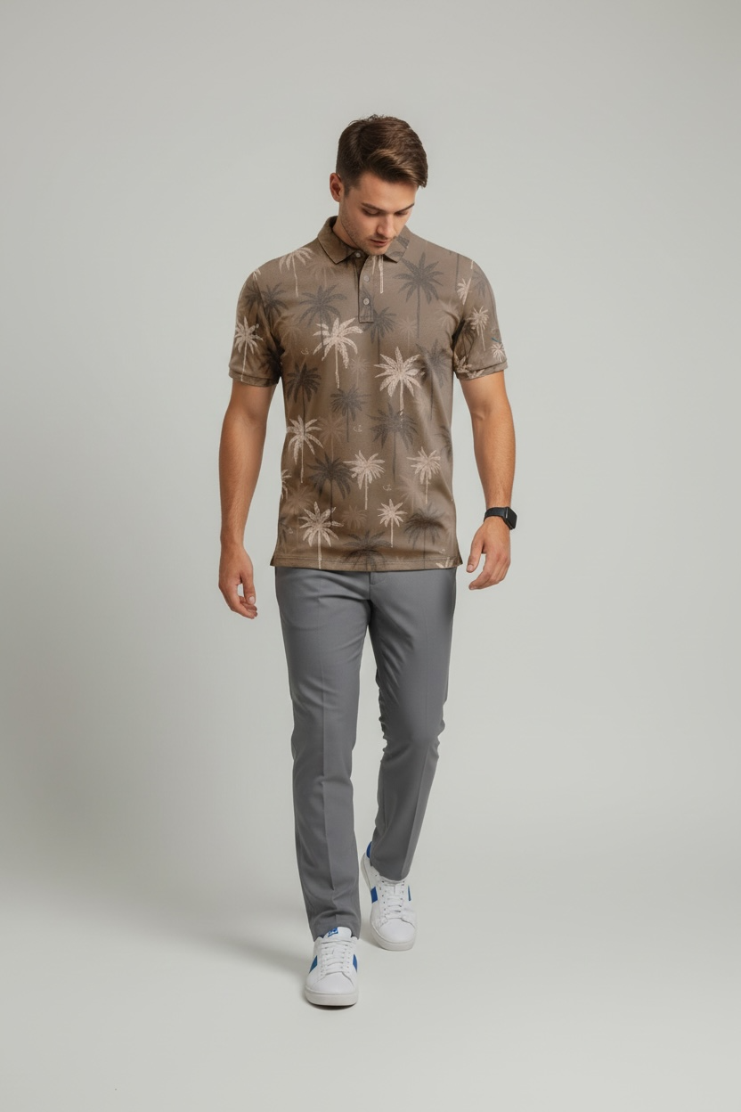 Rooted in island tradition, the "Nucifera Brown" polo draws inspiration from swaying palms and sun-wahsed landscapes. A layered palm tree pattern in warm brown and soft neutral tones creates a relased yet elevated look, effortless on the course and equally at home off it.