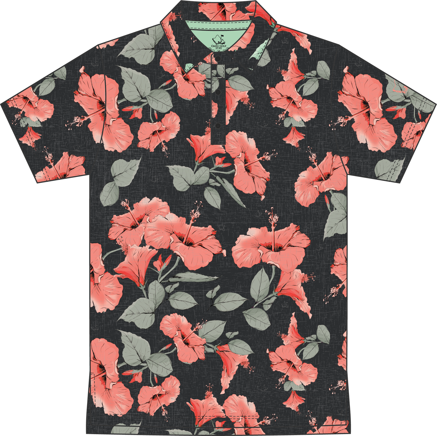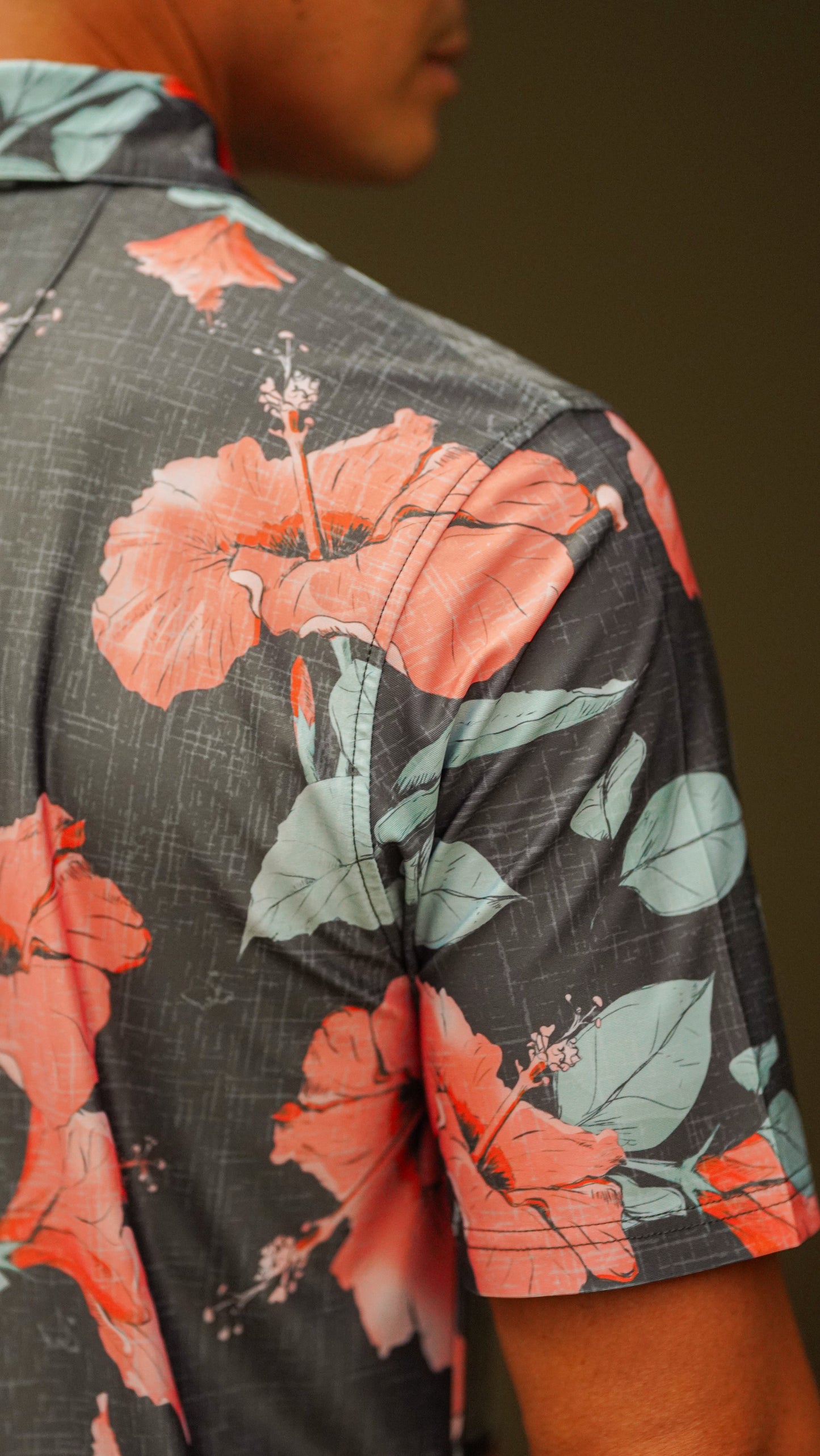Soft, warm, and effortlessly island-inspired, the Peaches and Cream Golf Polo delivers a refined take on classic Hawaiian florals. This golf polo features hand-illustrated hibiscus blooms in rich peach tones layered over a textured charcoal-gray backdrop, complemented by subtle mint leaf accents for balanced contrast.