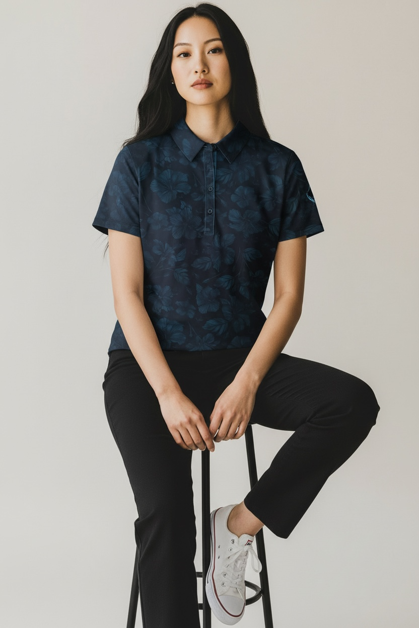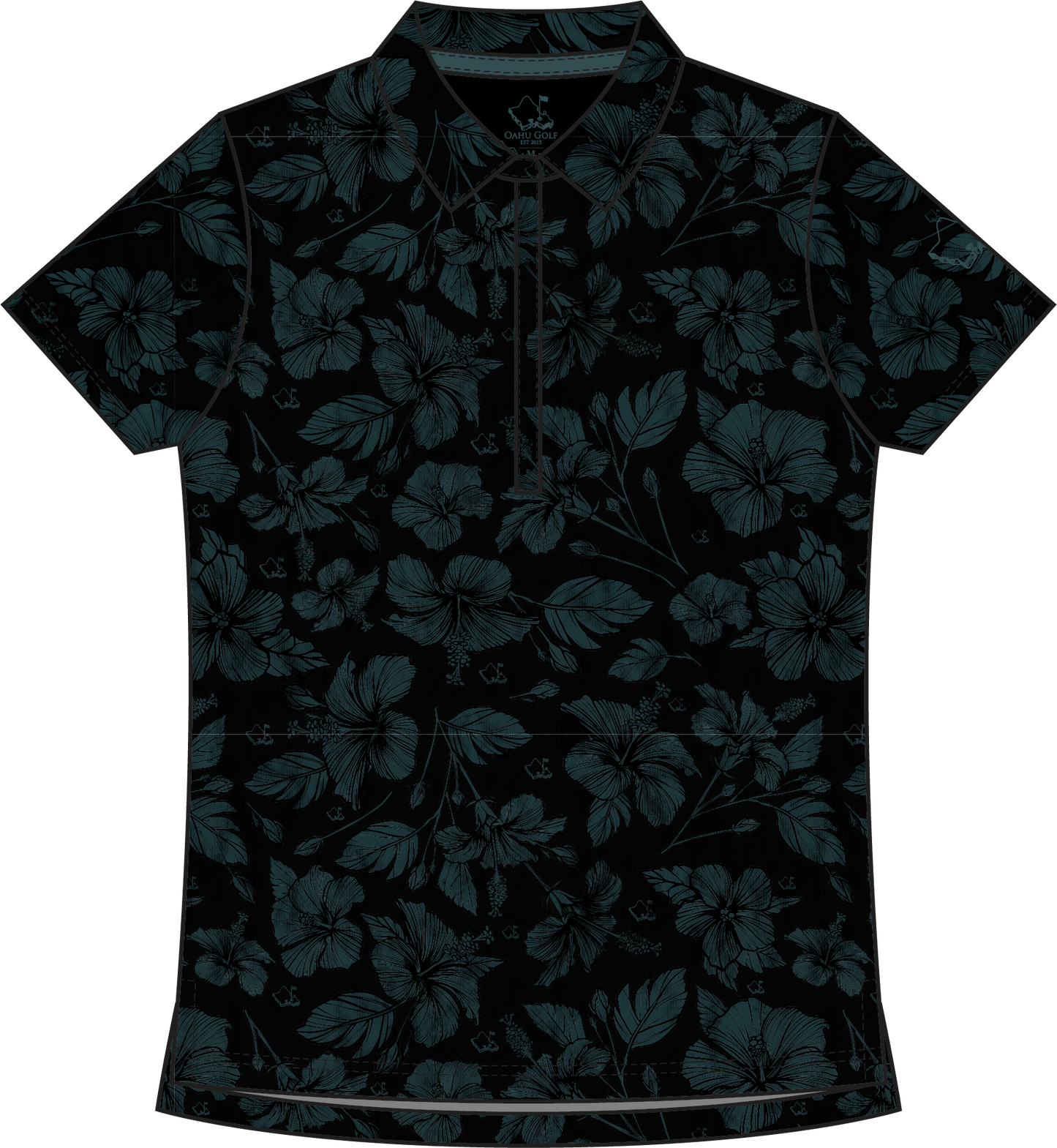 The hibiscus, Hawai‘i’s state flower, symbolizes beauty, warmth, and the spirit of aloha. Paired with the sleek dark palette, this polo blends island softness with a bold, modern edge.