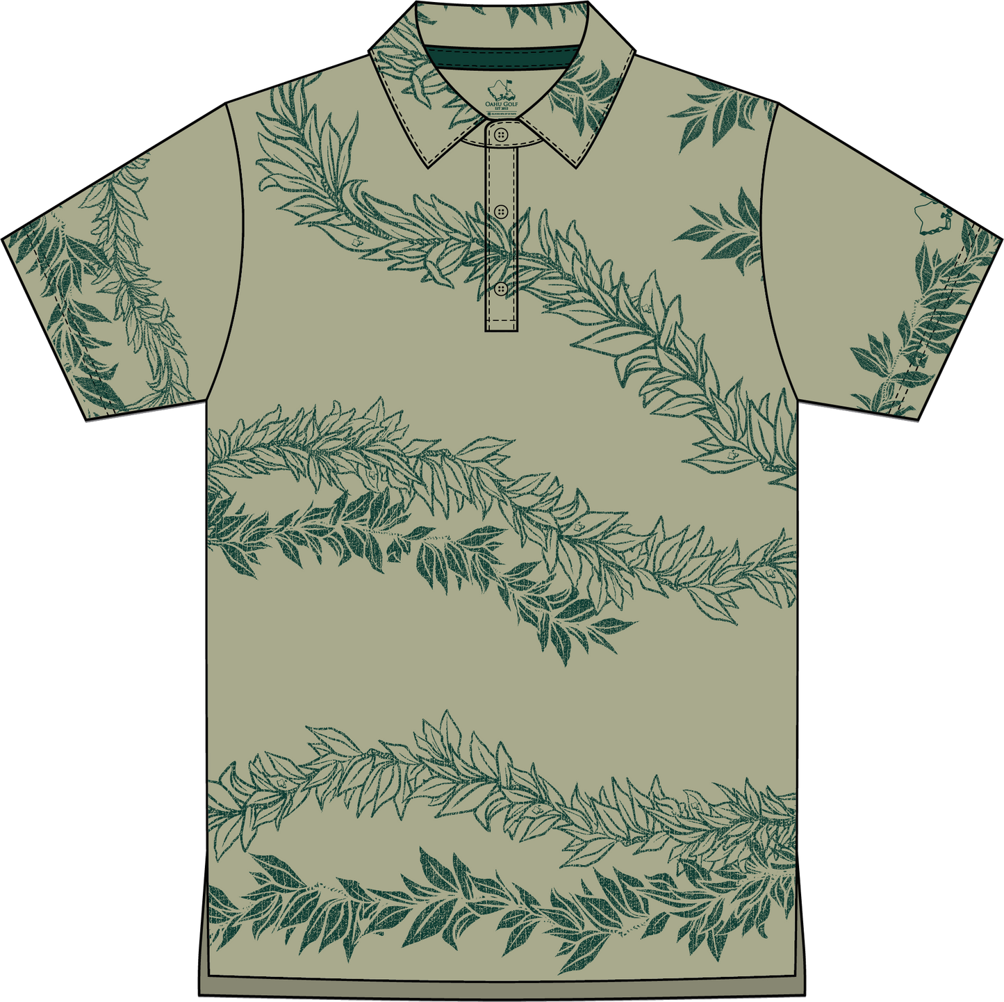 Maile 2026 brings the timeless beauty of Hawai‘i’s most revered lei to the course. Soft, earthy pale avocado green tones set the backdrop for sweeping strands of deep green maile, illustrated in graceful bands that wrap around the polo like a handwoven lei.