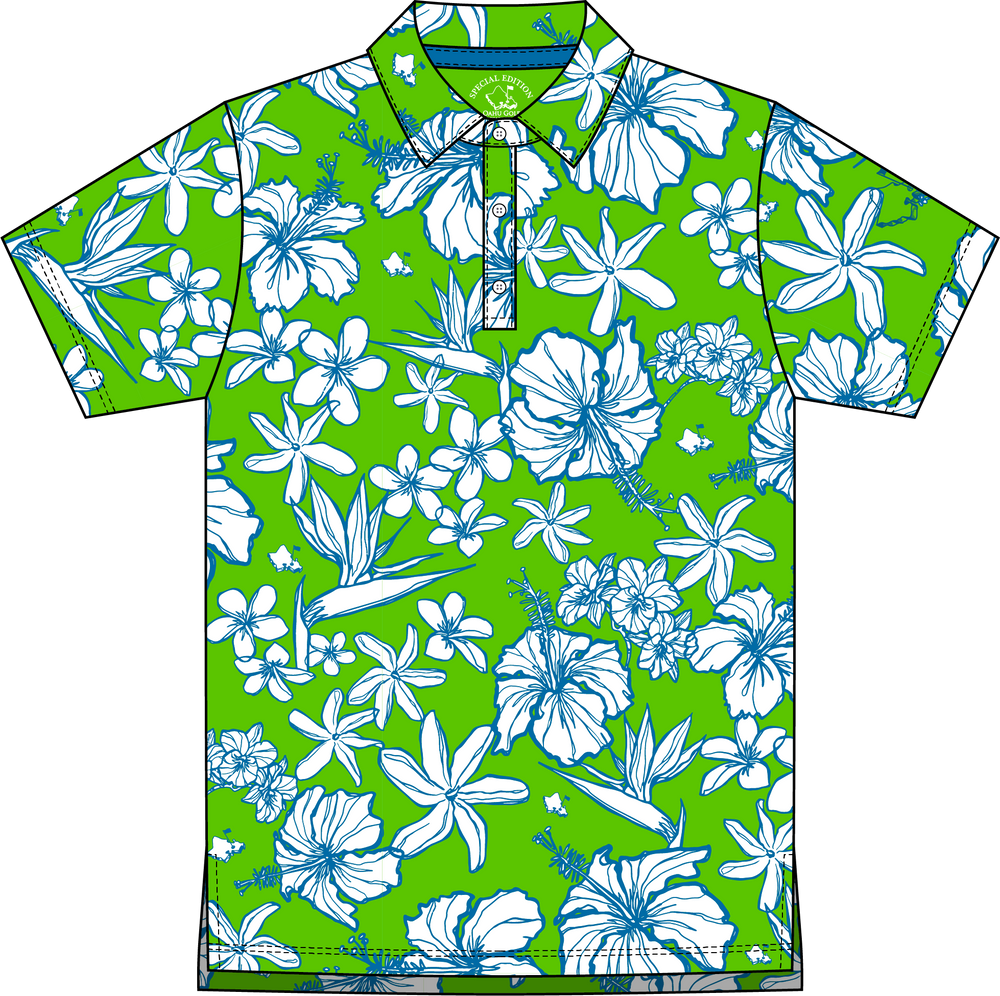 Channel the rare beauty of a Waikiki sunset with SKETCHY - CASCADE GREEN FLASH, a vibrant take on our signature Sketchy Floral design. Inspired by the elusive green flash that appears just as the sun meets the horizon, this polo blends striking green hues with accents of crisp white and deep blue, reflecting the seafoam and ocean colors of Waikiki Beach. The hand-sketched floral elements, including plumeria, hibiscus, and orchids, add an artistic island touch, making this polo a true standout. Designed with premium performance fabric, it offers superior breathability, stretch, and all-day comfort, perfect for both the fairway and post-game island vibes.